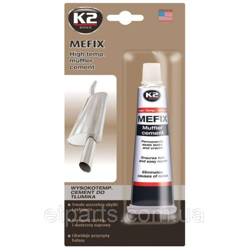 K2 MEFIX - високотемпературний герметик, призначений для монтажу і ремонту як нових, так і старих систем, вихлопних труб і каталітичних нейтралізаторів. Герметизує отвори та тріщини. Під впливом високої температури він твердне, як сталь. Легко поширюється. Після застигання не дає усадки і не кришиться, водонепроникний.
